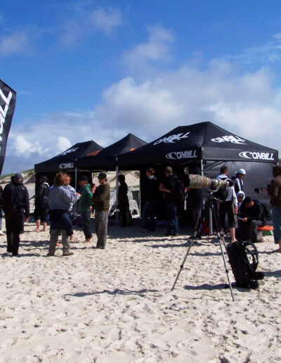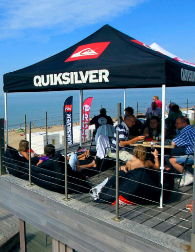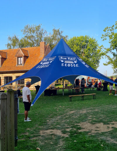 The tent fabric is 100% polyester, fire retardant and has a European fire certificate. The fabric is provided with technical coatings for waterproofing and mould-resistant. The UV coating in turn provides protection against sun and color retention. The fabric retains its elasticity and is tear-resistant even after long use. Various standard colors and full-digital printing are available.