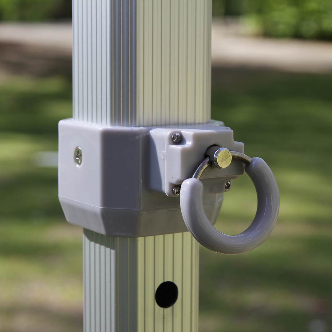 The top post is provided with a sturdy support of 15 mm thick that provides stable support for the roof. The top of the canvas is reinforced with an 8 mm thick metal ring and six sturdy 7 cm long straps to prevent tearing and absorb additional forces.