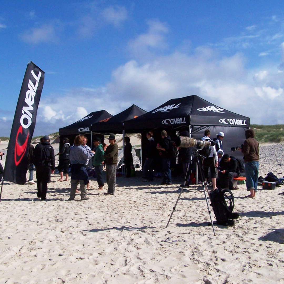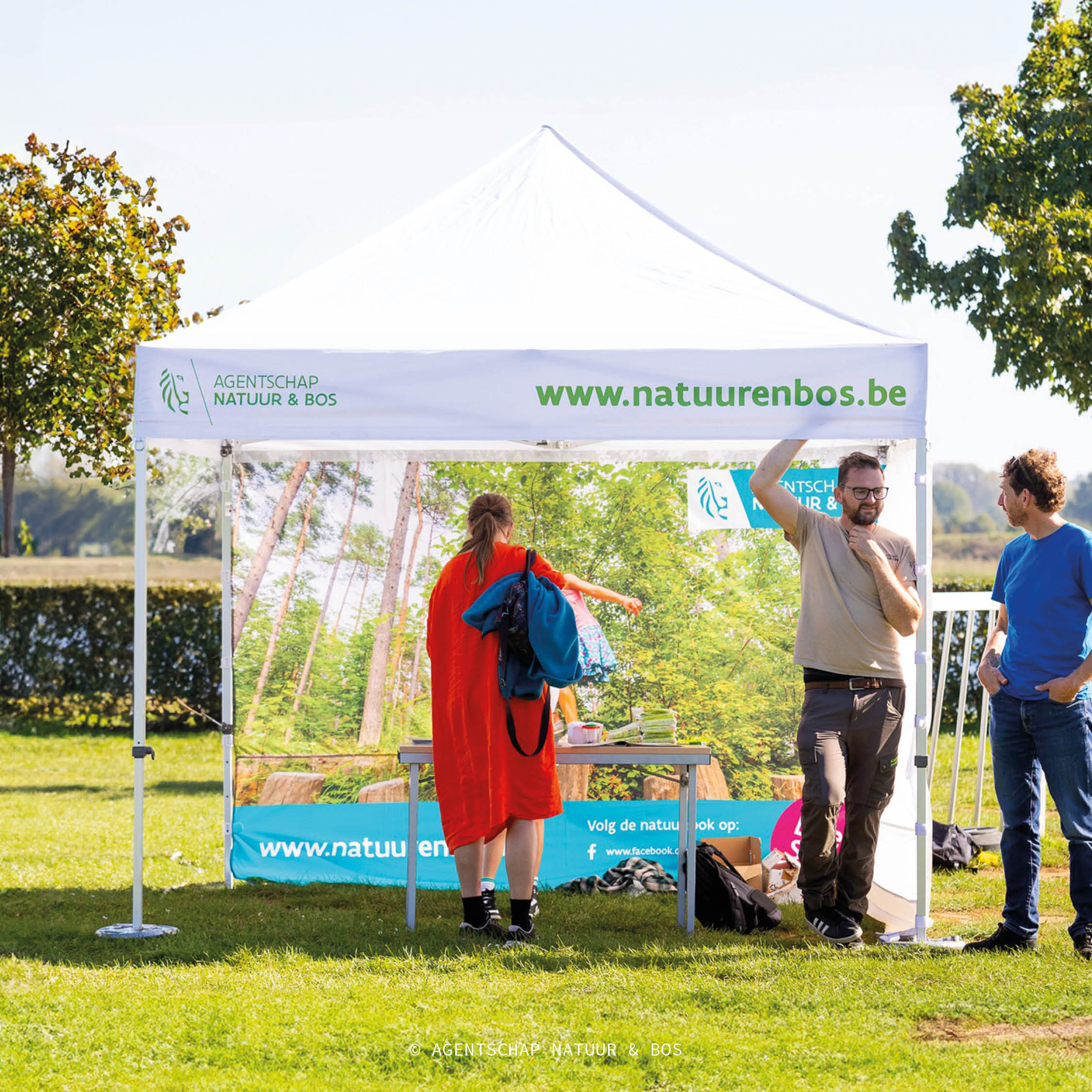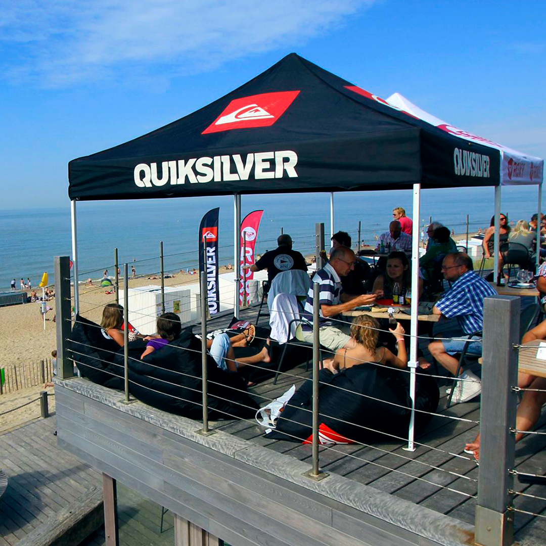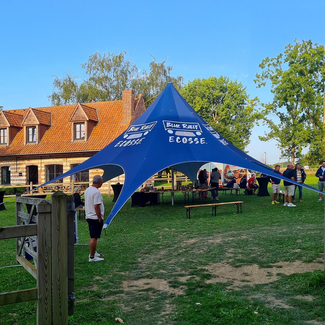 The tent fabric is 100% polyester, fire retardant and has a European fire certificate. The fabric is provided with technical coatings for waterproofing and mould-resistant. The UV coating in turn provides protection against sun and color retention. The fabric retains its elasticity and is tear-resistant even after long use. Various standard colors and full-digital printing are available.